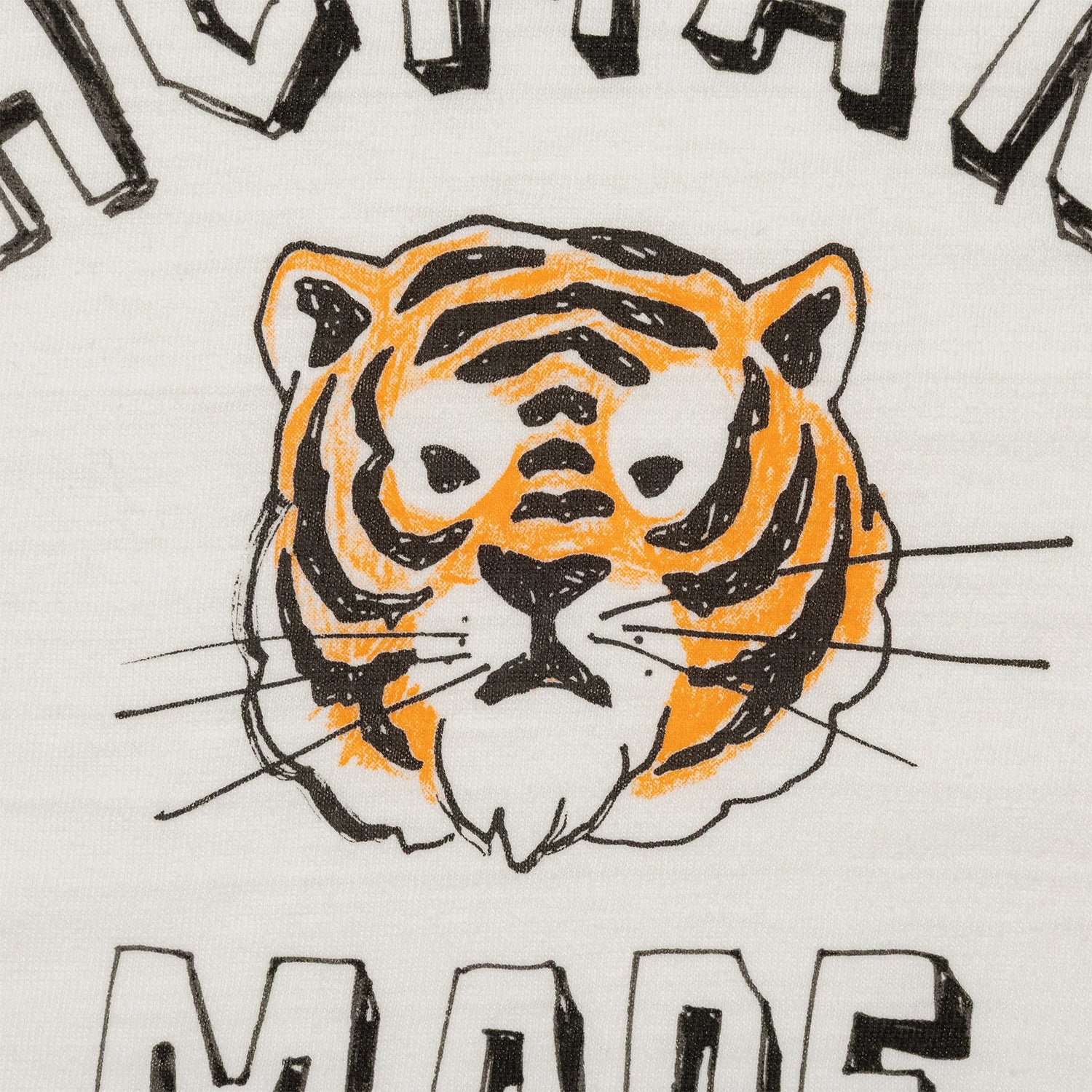 T-shirt made with HUMAN MADE's standard rounded body. A tiger graphic adorns the front, while the use of slub yarn results in a soft texture.