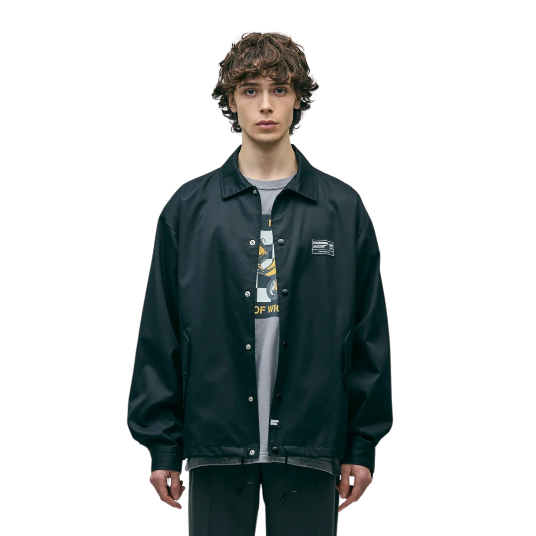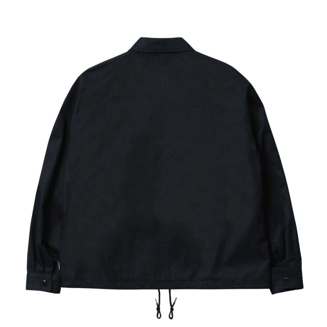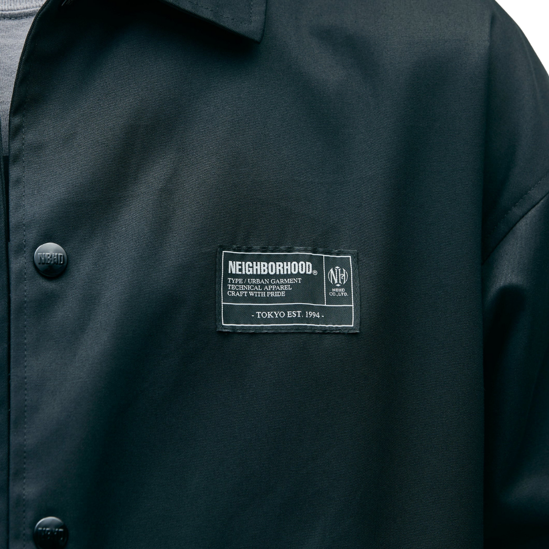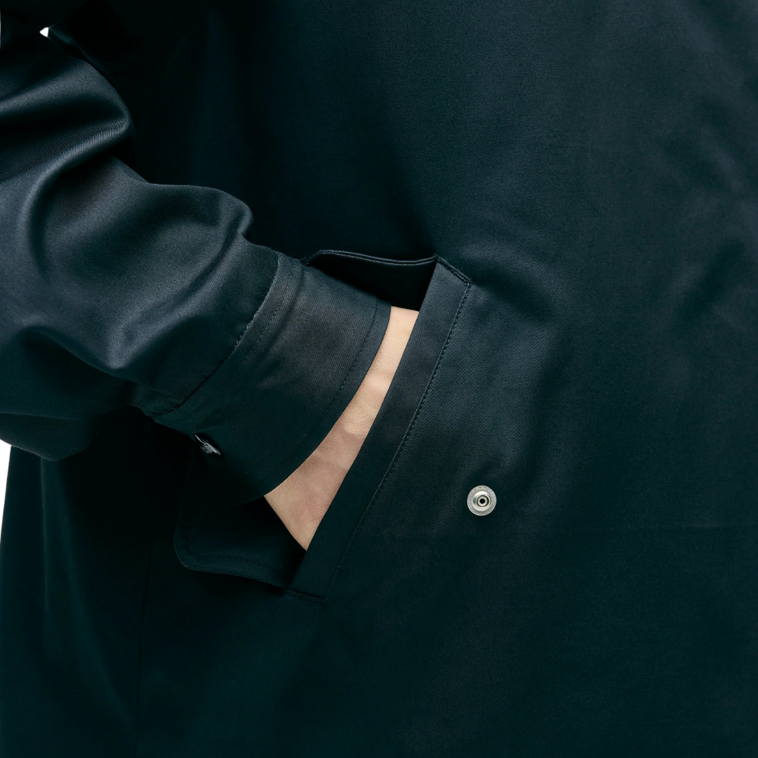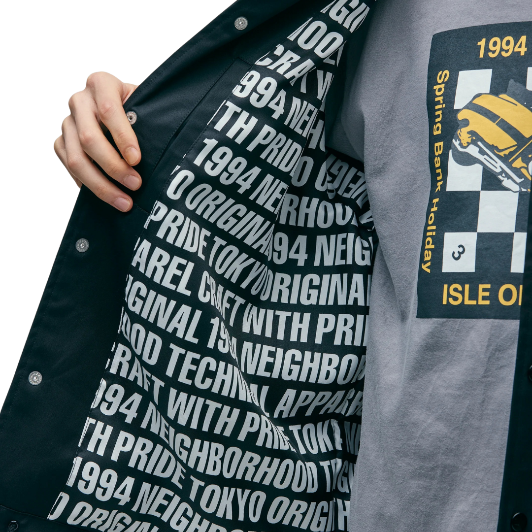 A windbreaker jacket made of high-density gabardine material with a delicate weave and water-repellent properties despite being made of cotton. Flap pockets on both sides. Built-in drawcord for adjustment at the hem. The lining uses an original pattern with graphics printed on it. Name tag and PIS name included.